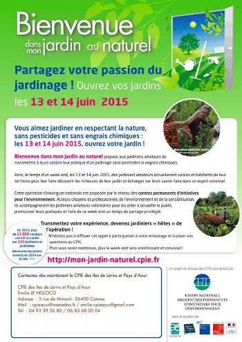 Vous aimez jardiner sans utiliser ni pesticides, ni engrais chimiques ? Les 13 et 14 juin 2015, ouvrez votre jardin ! Le CPIE des Iles de Lérins vous accompagne et vous aide dans l’accueil des visiteurs.